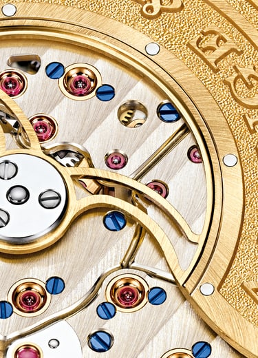 يخفف تصميم الأذرع الأربعة من تأثير الصدمات على الدوار الثقيل ويحمي الحركة من الإجهاد الشديد. التوليفة اللونية المتناغمة، بين وهج الذهب الدافئ وبرودة البلاتين المدهشة وزرقة البراغي الزاهية، تمنح الدوار جاذبية مدهشة وتجعله محورًا للأناقة الفنية المطلقة.