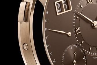 من النظرة الأولى، تؤكد ساعة LANGE 1 DAYMATIC بلا أدنى شك على انتمائها لمجموعة ساعات LANGE 1 الأصيلة، لكنها تُعيد صياغة هذا التصميم الأنيق الذي نال العديد من الجوائز. على الرغم من أن تصميم الميناء المميز لساعة LANGE 1 ذات التعبئة اليدوية يُزيّن أيضًا ساعة LANGE 1 DAYMATIC، إلا أنه يقدم نفسه في تناظر معكوس ومبهر: فعرض الساعات والدقائق انتقل إلى الجانب الأيمن من الميناء، بينما استقر ميناء الثواني الفرعي والتاريخ الكبير على اليسار.