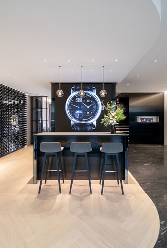 A. Lange & Söhne's precisely made wristwatches are displayed throughout the shop, which is also fitted with an exclusive, private VIP area.